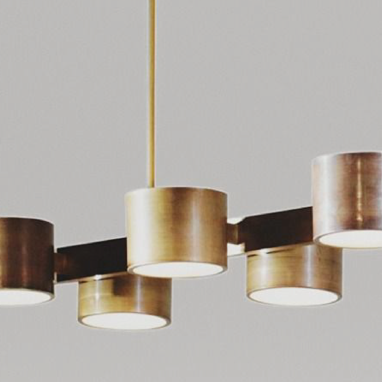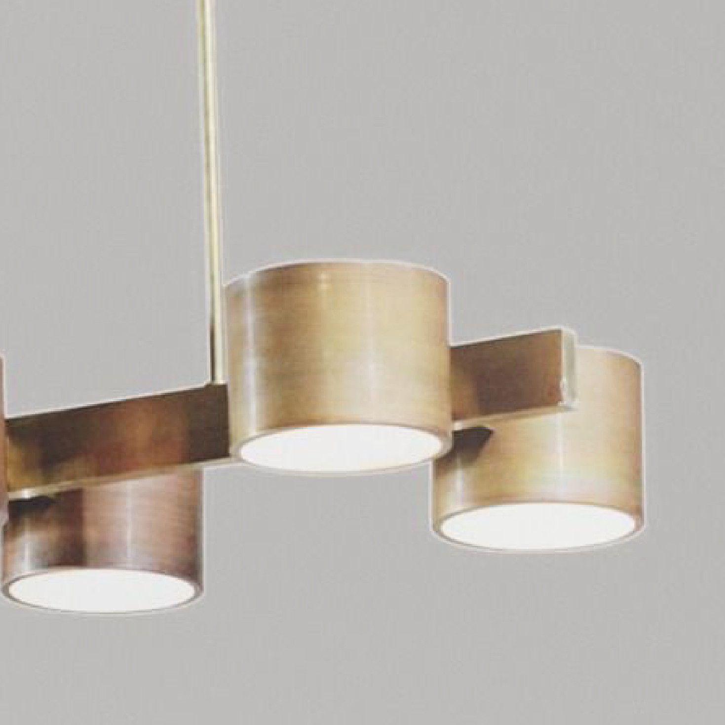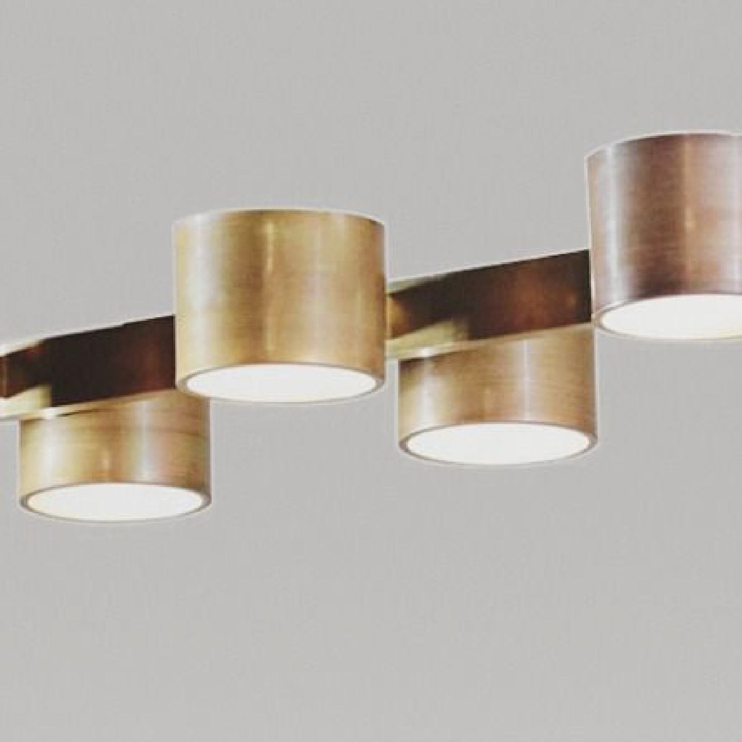 materiais Estrutura em tubo metálico galvanizado, revestida com folha natural de pau-ferro. Luminárias em latão escovado, com lâmpadas LED G9 2W Stella. Suspensão por cabos de aço.